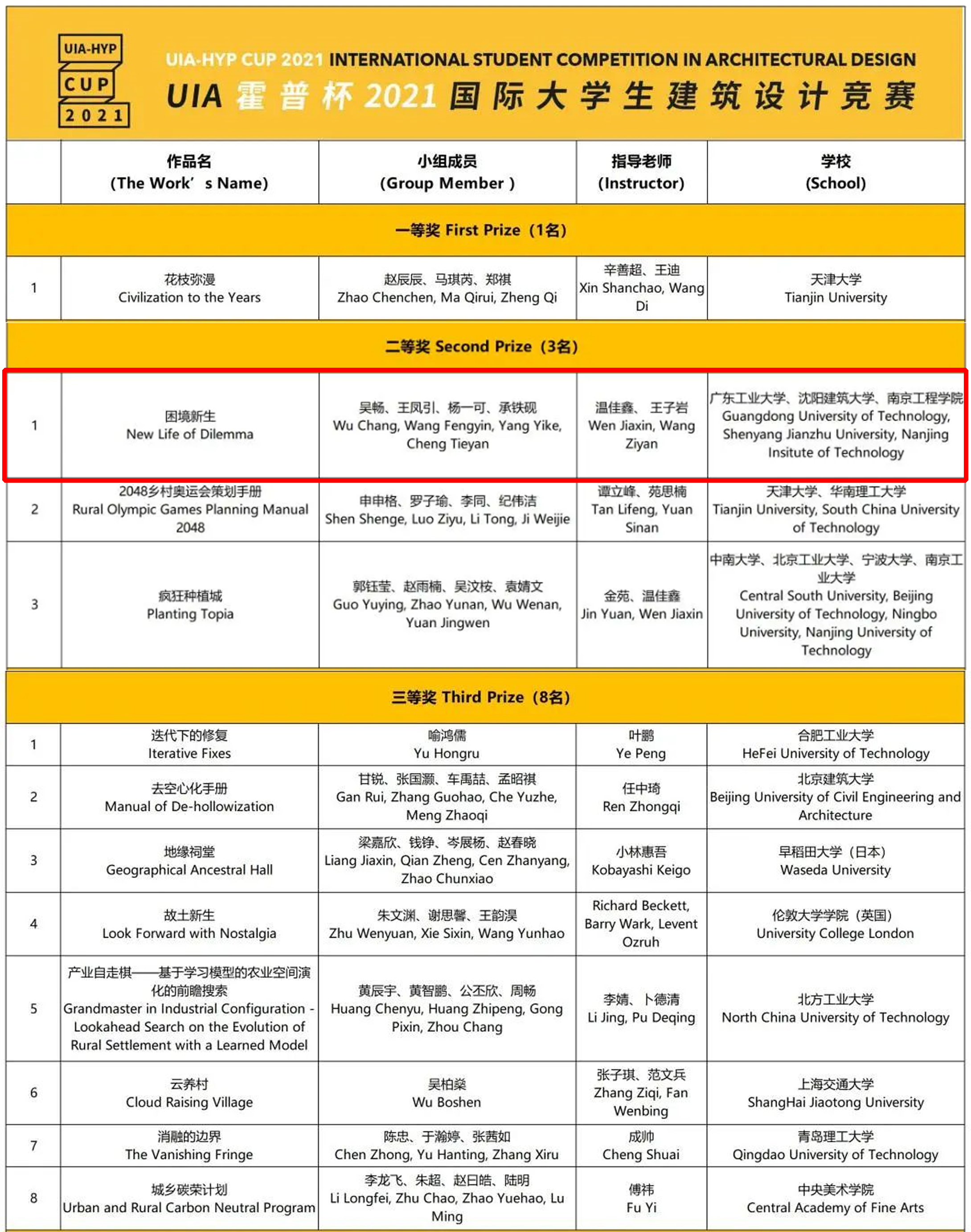附:“UIA-霍普杯国际大学生建筑设计竞赛”始于2012年,已连续成功举办九届。本届比赛由国际建筑师协会(UIA)为国际主办单位,天津大学建筑学院、《城市·环境·设计》(UED)杂志社主办,中央美术学院建筑学院联合主办。每届竞赛的评委会主席由一名国际著名建筑大师担任,竞赛评委为来自国内外的著名建筑师及学院院长。本届(2021)UIA-霍普杯由普利兹克建筑奖得主、OMA(大都会)建筑事务所及AMO创始人、哈佛大学教授雷姆·库哈斯(Rem Koolhaas)担任主席并拟定题目“乡村困境——新乡村设计”。本届竞赛共有来自全球约1500组学生报名参赛,组委会邀请到13位国内外知名建筑师、建筑教育家担任评委,在进行多轮评图与讨论交流后,最终为此次竞赛落槌定音,甄选出35组获奖作品,其中包括一等奖1组,二等奖3组,三等奖8组,优秀奖23组。