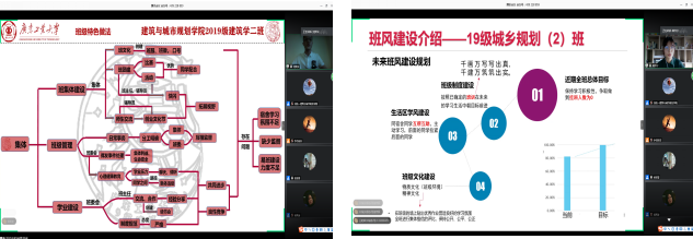 大赛初始,各位评委老师开麦为各班加油打气,鼓励同学们尽情展示风采。各班依次演讲并进行答辩,重点展示班风建设现状、特色做法、易班建设情况以及未来规划等。建筑学1班的宿舍长制大大提升了班级管理效率,建筑学2班的规划思维导图清晰明朗深受师生好评,城乡规划1班在学生工作方面的贡献度让师生印象深刻,城乡规划2班在如何提升全体同学的贡献度上颇有思考,风景园林1班力争打破男女生的格局限制勇创佳绩。各班基于自身特点,分析建设现状和问题,并大胆提出规划思路和计划方案。