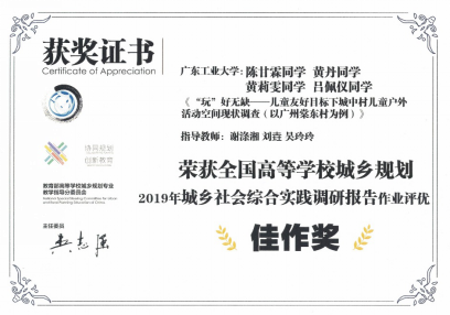 谢涤湘教授、刘垚老师、吴玲玲老师指导的《“玩”好无缺——儿童友好目标下城中村儿童户外活动空间现状调查(以广州棠东村为例)》和谢涤湘教授、刘垚老师指导的《暗“住”陈仓——广州十三行批发市场影响下的“住改仓”情况调查》分别荣获全国高等学校城乡规划“2019年城乡社会综合实践调研报告作业评优佳作奖”。69书吧
