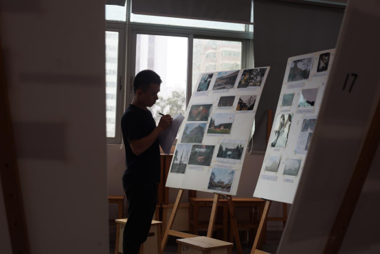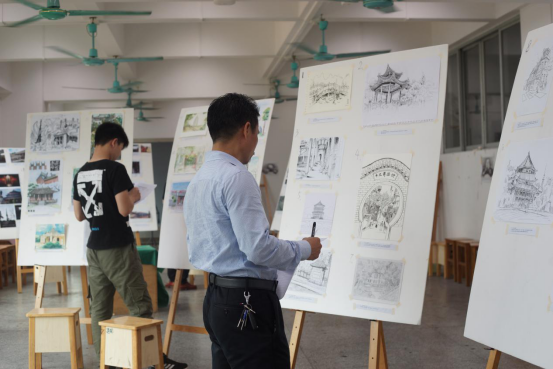 的王梦蕊老师、梁端德老师和肖希老师以及艺术与设计学院的林开老师。老师们现场对三个组别摄影组、绘画彩色组以及绘画黑白组的每一份作品仔细评分。评分完毕后,秘书部相关人员对老师们井进行了采访。老师们对这次的参赛作品进行了一定的肯定,并称在其中看到了许多出彩的地方。同时却也对本次绘画组作品较少的现象表示遗憾,期待下一次的写生大赛能给他们带来更大的惊喜。