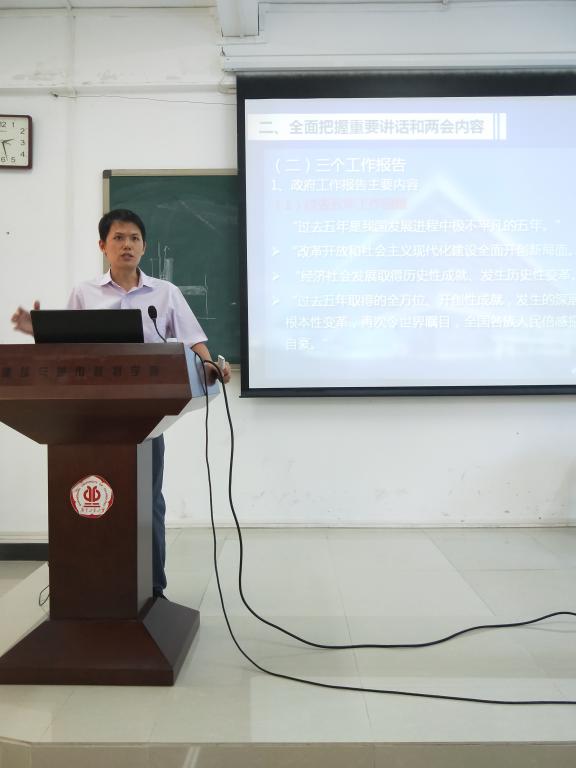 于2018年5月15日下午在学院314会议室召开“学习贯彻习近平总书记重要讲话精神和全国两会精神”辅导报告会,报告由马克思主义学院周兵副教授主讲。会议由学院党委钟兆明书记主持,69书吧