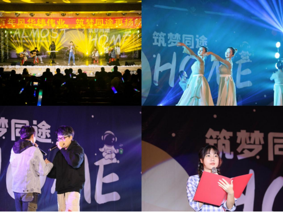 之后,各类歌舞、话剧等精彩节目轮番上演,给在场的观众们带来了一场美妙的视听盛宴。歌唱队与器乐队合作的《克卜勒》以轻柔动人的旋律,抚平了观众们躁动的心情;校舞蹈团带来的《雨涧春行图》,清丽的舞姿摇曳在舞台之上,展现出了一种清新脱俗之美;大地音协带来的第三场乐队表演——《凄美地》将观众们的情绪拉到了最高点,全场的气氛都被调动了起来;21级建筑类1班的同学带来的话剧《觉醒年代》带我们重新回到了那段充满热血的年代,认识中华人民觉醒的历程,引人入胜;21级建筑类4班带来的《Hey KONG》以充满律动的说唱,述说了对朋友的问候、感激与想念;而舞蹈队带来的舞蹈串烧——《蛇皮出动》则是又一次调动了观众的热情,将全场气氛推向了第二次的高潮;歌唱队的深情演唱《一万次悲伤&你就不要想起我》歌曲串烧,动人的歌声缭绕全场,两首不同风格的歌曲相遇,带来了不一样的烟火;歌曲《祖国不会忘记》展现出了同学们对祖国饱含的深沉的爱;21级建筑类2班的合唱《夜空中最亮的星》温婉动人的歌声,让人仿佛看见了夜空中的那颗星,那颗点亮人生的星;晚会的最后,希音国诵用他们坚定而有力量的声音,诵出了对祖国的热爱与自豪,更诵出了对祖国的骄傲,为本次晚会带来了一个完美的尾声。