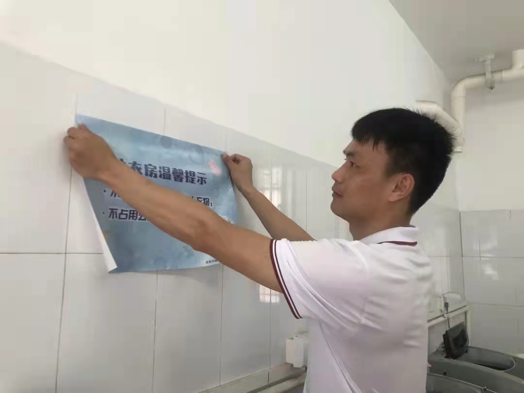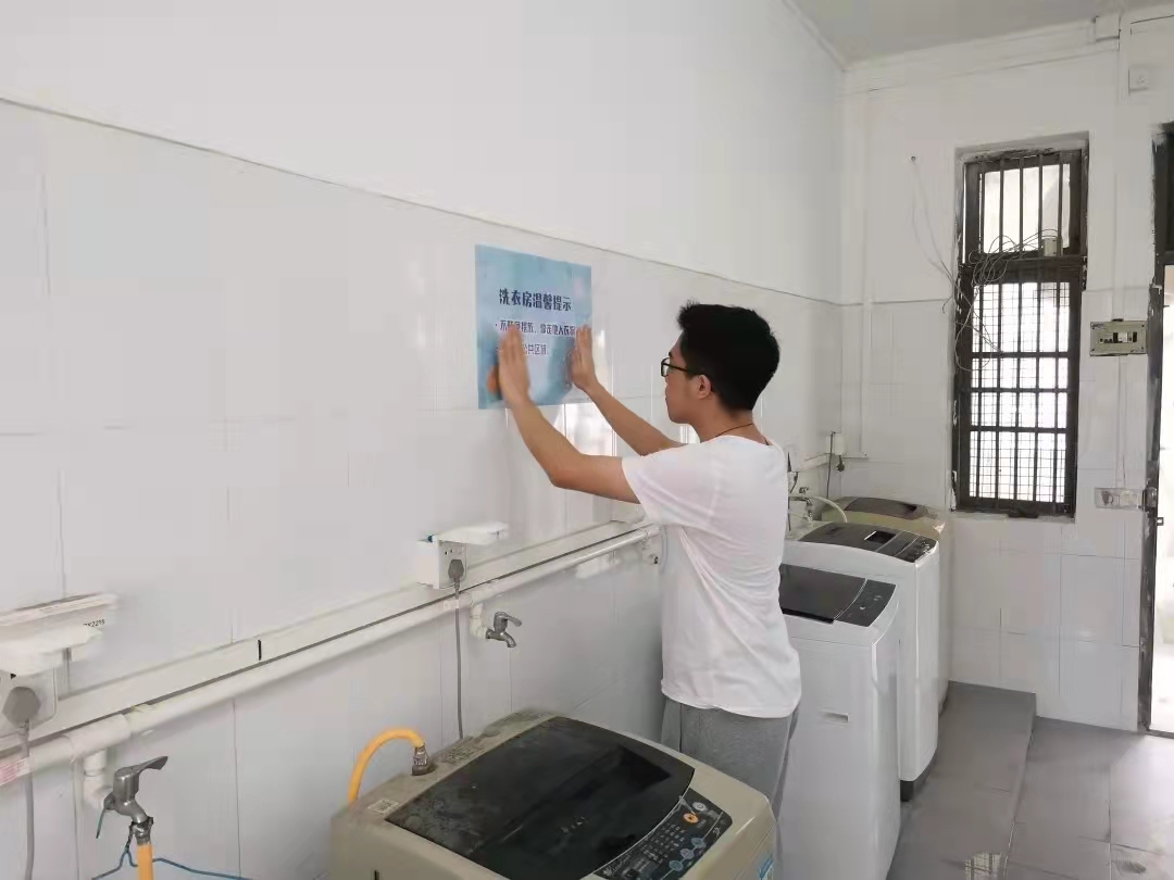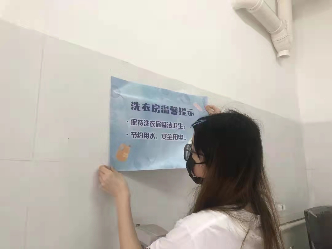 3月15号中午13:00,红会的小伙伴们领取打印好的标语纸张,前往各自负责的洗衣房进行张贴。