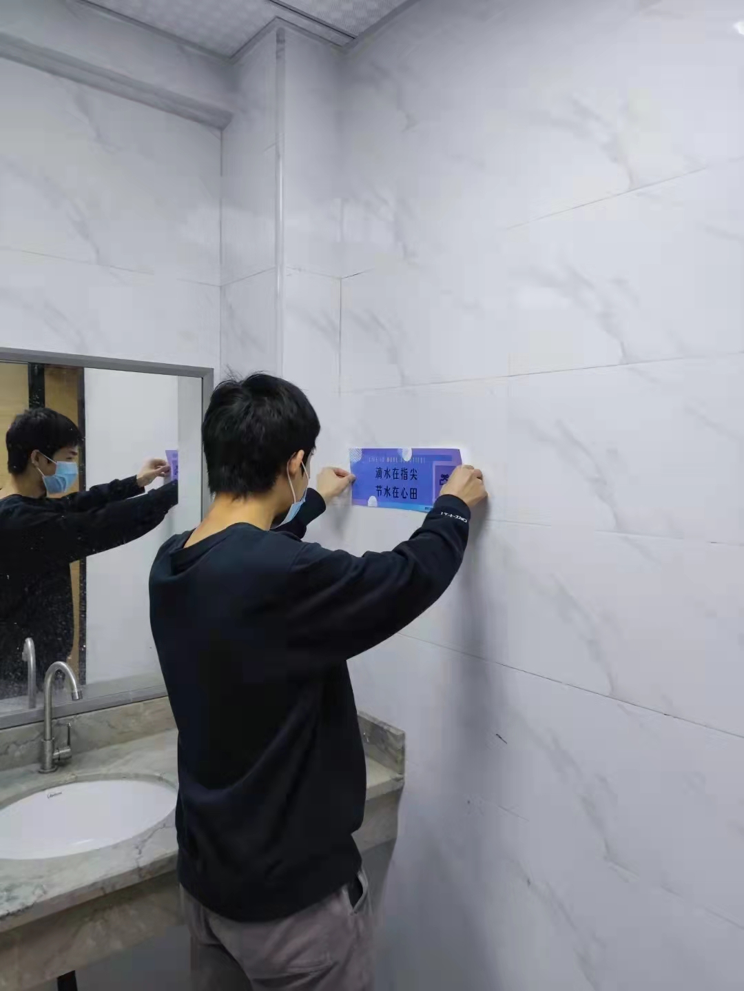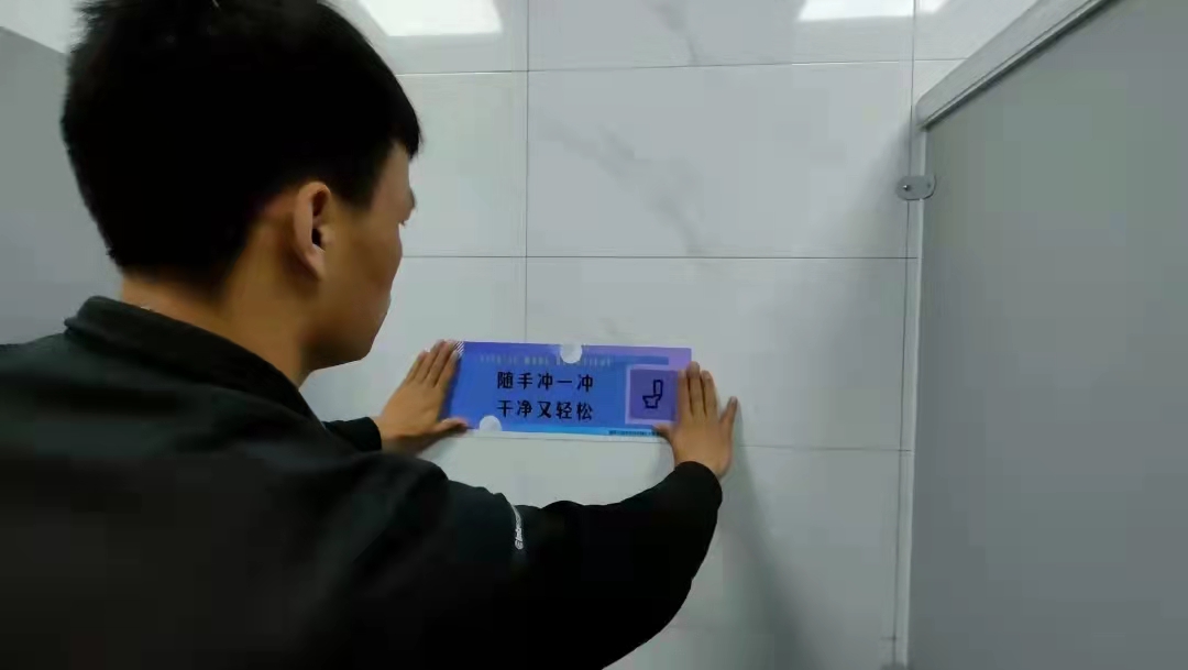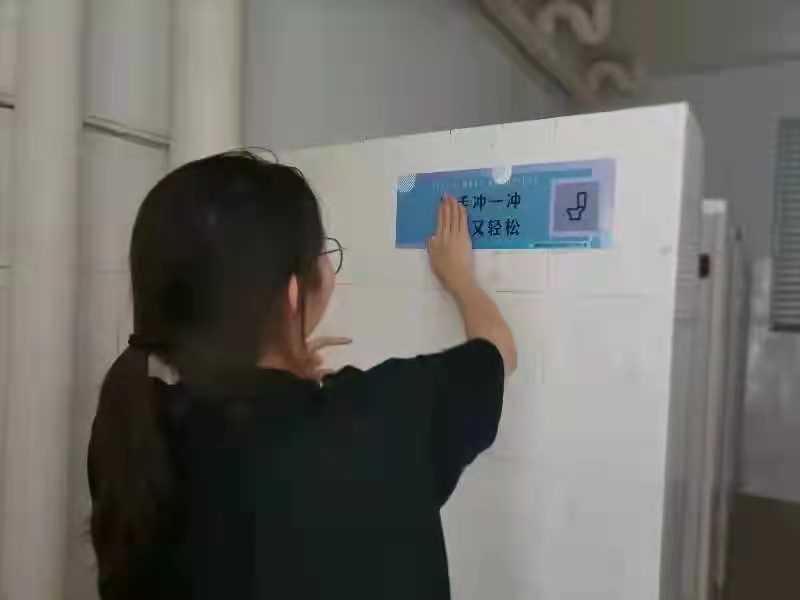3月21号中午13:00,红会的小伙伴们领取打印好的标语纸张,前往卫生间进行张贴。