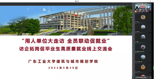 党委书记钟兆明、院长蔡云楠、党委副书记李晓伟、毕业班辅导员、班主任和广东省建筑设计研究院有限公司、广州市设计院集团有限公司、广州市华阳国际工程设计有限公司、广东博意建筑设计院有限公司、广东国地规划科技股份有限公司、广东天元建筑设计有限公司、广州天萌建筑设计有限公司等十余家业内优秀企业代表共同出席了此次线上交流会。