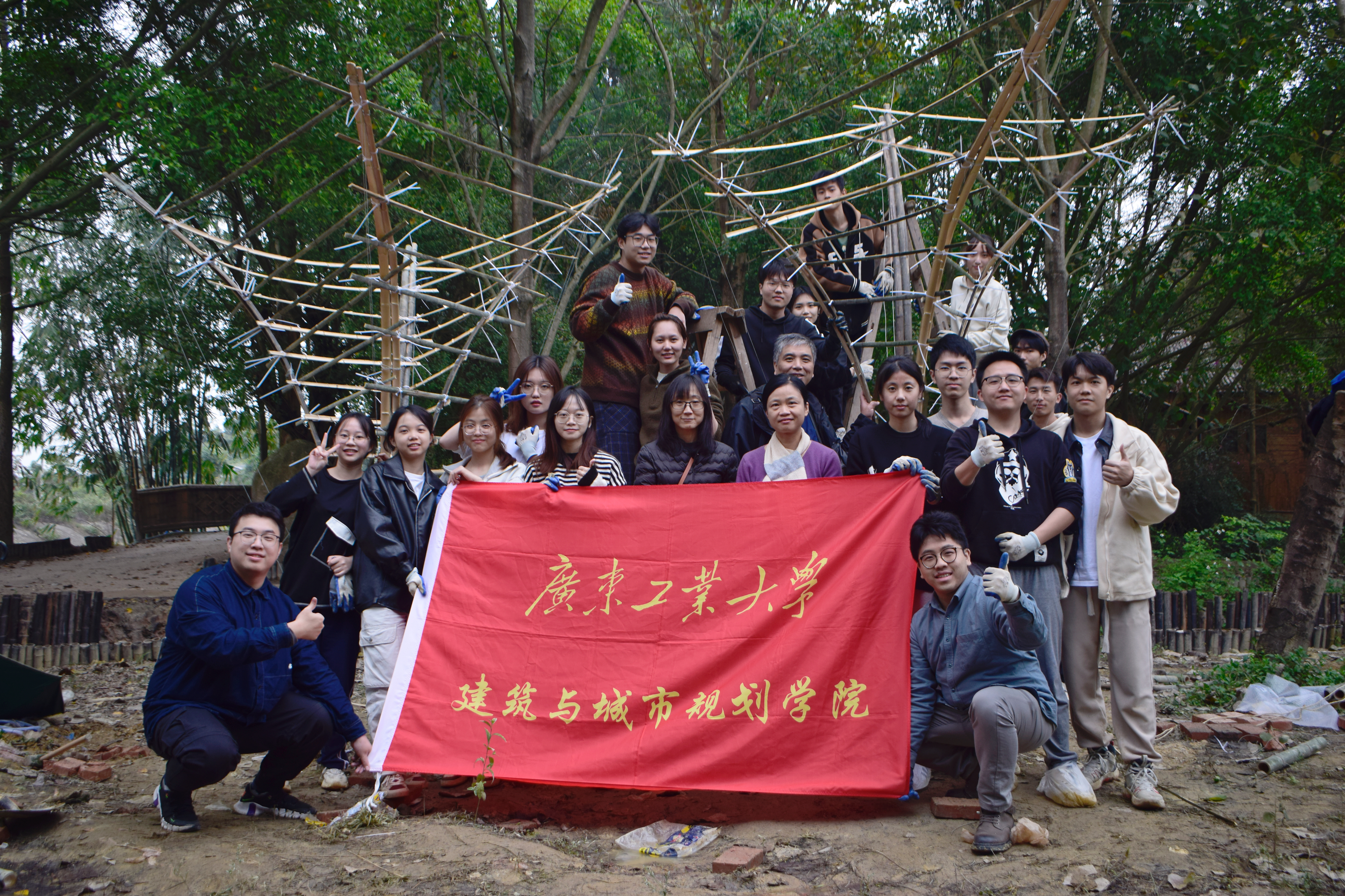 的汤众教授全程进行技术指导。广东建中新竹材科技有限公司提供搭建材料赞助。前期团队做了四个乡村景观和可移动式乡村市集的竹构设计方案;后期现场搭建选取了其中两个设计作品。为了使设计成功落地,团队对设计方案的可行性和构造细节做了多轮修改和完善。搭建过程中,师生白天在现场工作,晚上则对当天的工作进行总结和下一步调整完善。从选料、开料到打基础、搭建,最终在2月15日中午成功完成了搭建任务。
