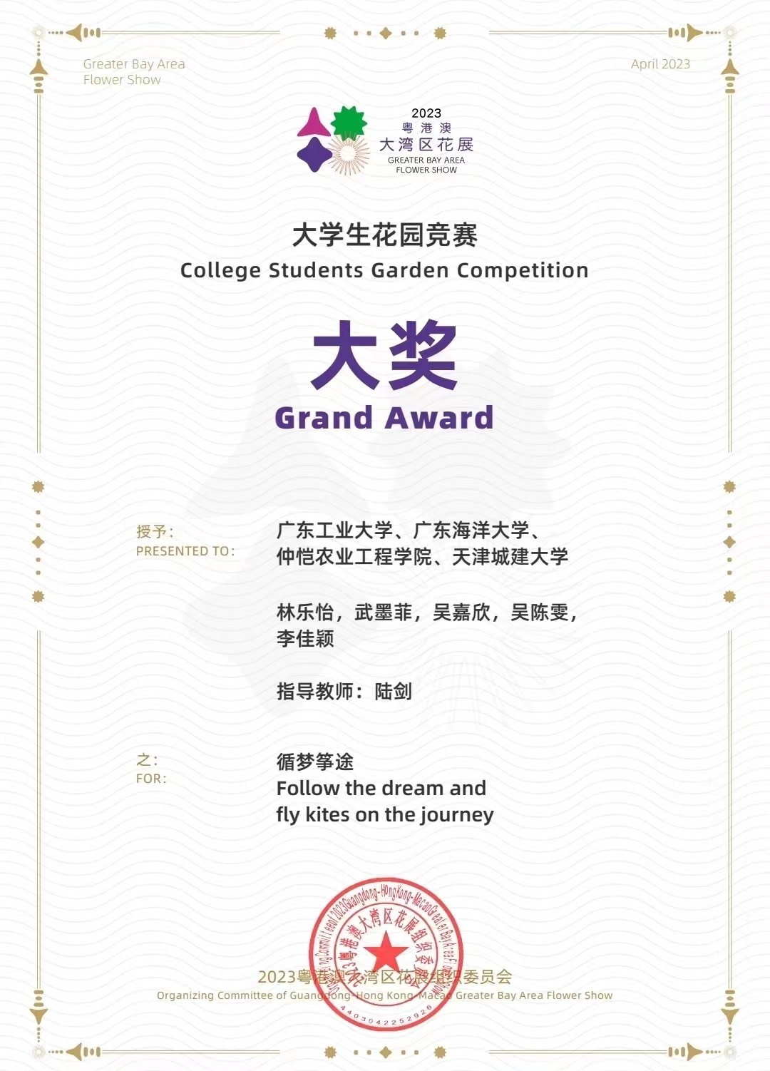 、广东海洋大学、仲恺农业工程学院和天津城建大学等4所大学的5名本科生设计的花境《循梦筝途》在百余份作品中突围而出进入决赛的答辩环节,并得到与会专家的肯定,收获大奖。获奖作品的简介如下。