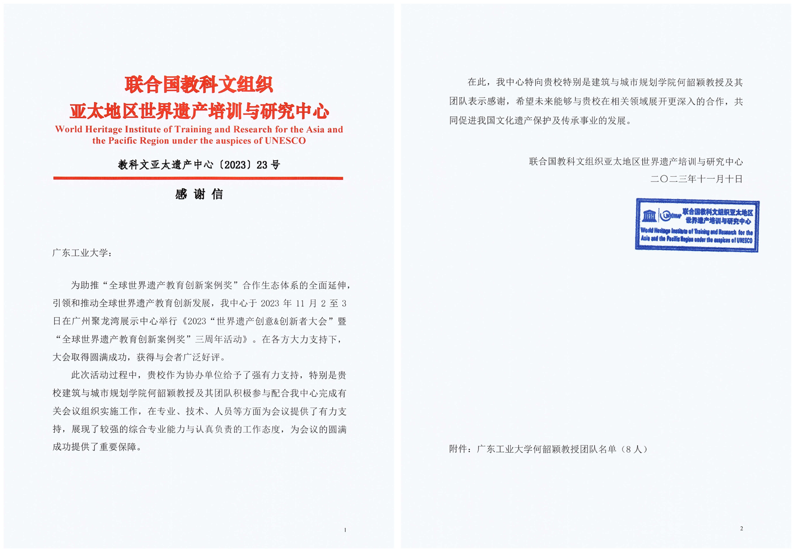 大会汇聚了最具前沿与代表性世界遗产创意&创新者及其最新实践探索,创新采用“头脑风暴+沉浸艺术+遗产场景”的多维互动结构,为各方深度跨界交流提供最佳的创意氛围。何韶颖教授团队的城乡遗产数字化保护与活化工作案例也受邀在大会上进行了展板展示。团队扎实的专业能力及认真负责的工作态度,展现了团队师生优秀的综合素质,获得了亚太中心的高度认可。大会圆满落幕后,亚太中心专门向学校发来公函,向学校和团队表示感谢,并表达未来与我校在文化遗产保护领域展开更深入合作的意愿。