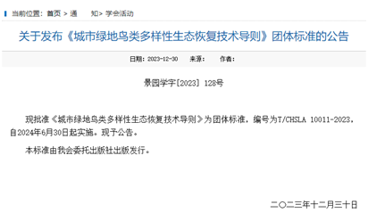 中国风景园林学会于2023年12月30日正式发布《城市绿地鸟类多样性生态恢复技术导则》团体标准,编号为T/CHSLA 10011-2023,自2024年6月30日起实施。这一标准旨在为城市绿地的鸟类生态恢复提供科学指导,并推动城市绿地建设与保护工作。该导则由我校牵头编制,参编单位分别为广东省科学院动物研究所、广州草木蕃环境科技有限公司、中国城市建设研究院有限公司、中国科学院昆明动物研究所、上海市园林科学规划研究院、广东省深圳市生态环境监测中心站、广州市华南自然保护与生态修复研究院。