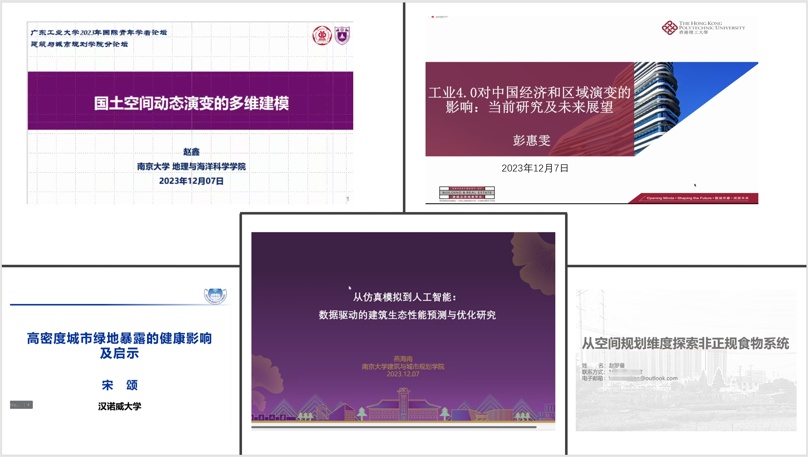 燕海南博士以“从仿真模拟到人工智能——数据驱动的绿建性能预测与优化研究”为题,分享了他在绿色建筑领域的最新研究成果;香港理工大学建筑与房地产系彭惠雯博士以“工业4.0对中国经济和区域演变的影响”为题,深入剖析了工业4.0对中国经济发展和区域演变的影响;德国亚琛工业大学赵罗曼博士则“从空间规划纬度探索非正规食物系统”分享了她在空间规划和非正规食物系统研究方面的探索;南京大学地理与海洋科学学院的赵鑫博士以“国士空间动态演变的多维建模”为题,介绍了她在国士空间动态演变方面的相关研究;德国汉诺威大学宋颂博士的“高密度城市绿地暴露的健康影响及启示”报告则引发了大家对高密度城市绿地健康的思考。