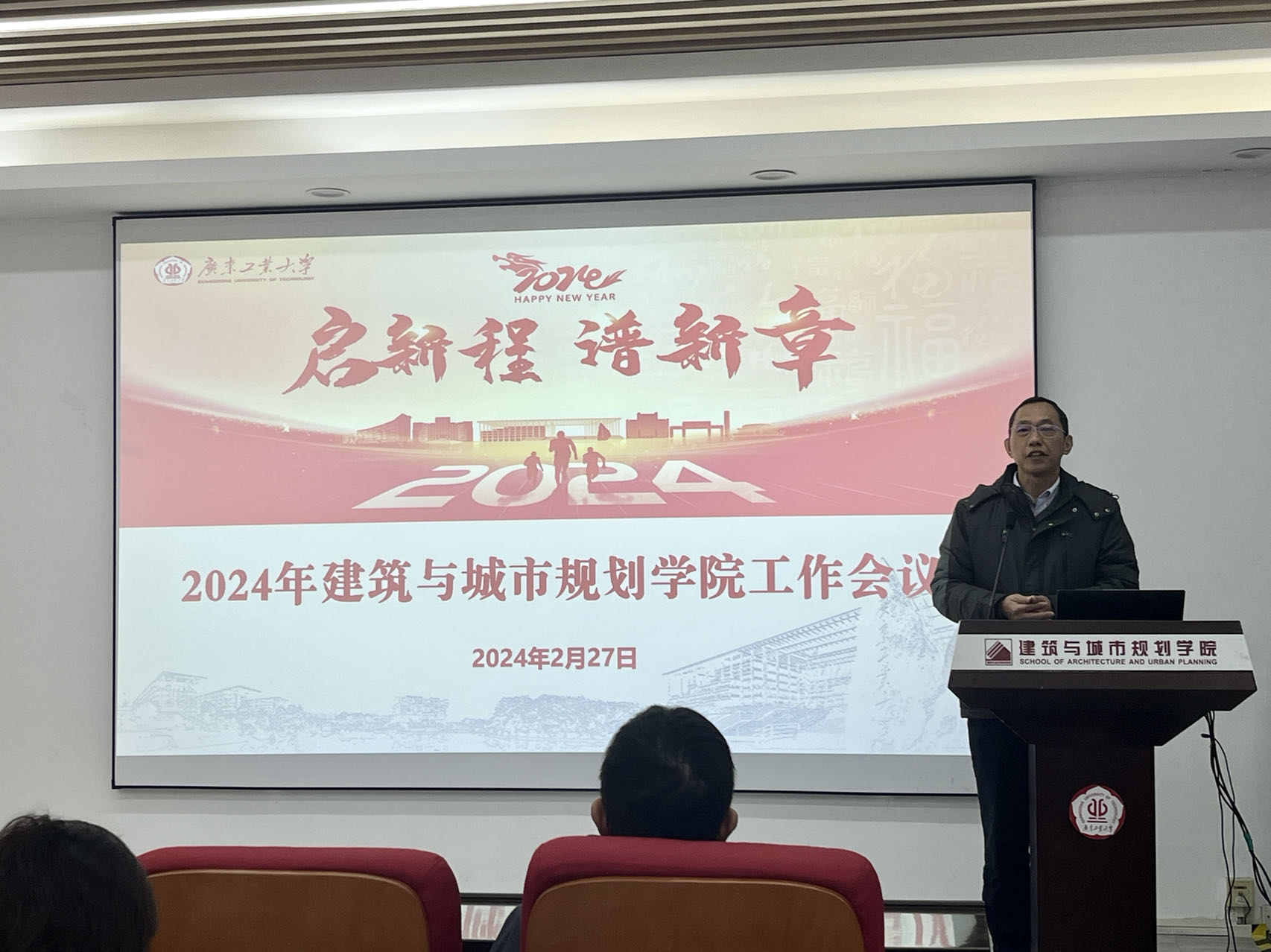 会上,学院党委书记王伟文、院长蔡云楠先后向全体教职工传达了2024年学校工作会议精神,带领大家学习胡钦太书记和校长邱学青在会上作的工作报告。接着,院长蔡云楠回顾了学院2023年的十件大事,结合学校发展大势、学科发展形势认真分析了学院未来发展的形势和面临的挑战。“春种一粒粟,秋收万颗子”。院长蔡云楠向全体教职工敲响了奋进的战鼓。他希望全体教职工在新的学期要拿出赶早的心态、赶考的姿态,坚定信心,铆足干劲,爬坡过坎,奋勇攀撑,相信终会迎来收获的喜悦,广工和建院的发展也将走上新的高度。