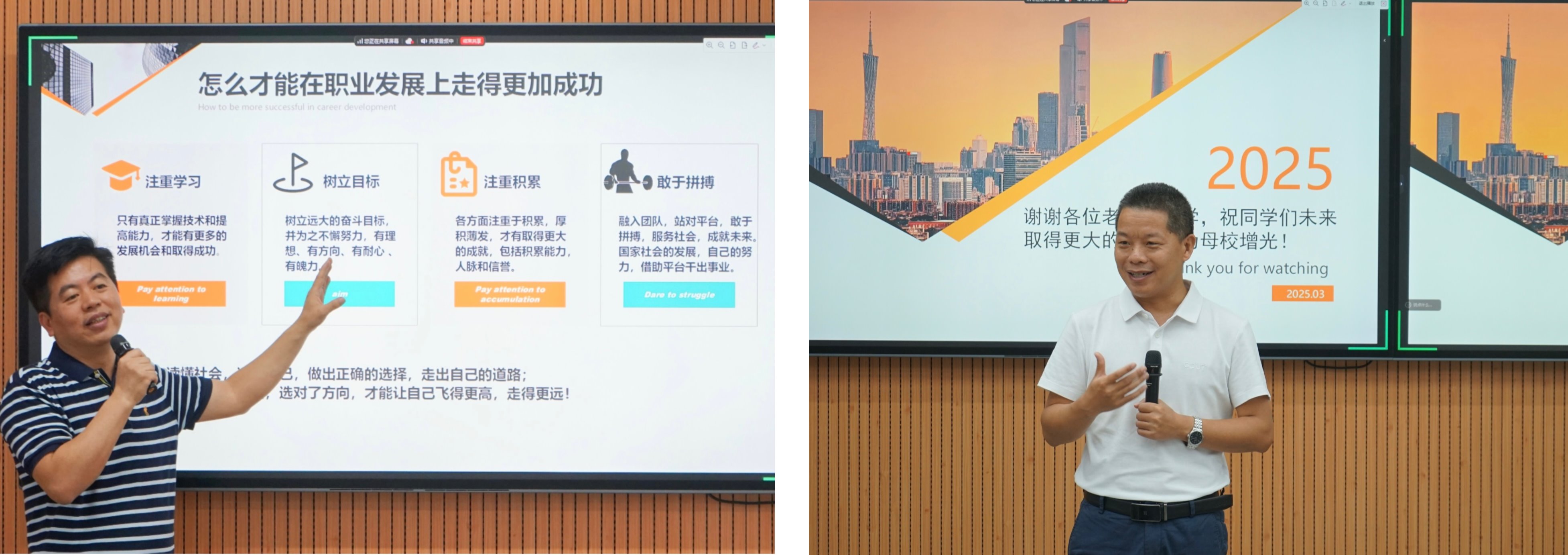 互动环节气氛热烈,同学们就就业城市、行业、公司的选择,大学生创业以及职业发展成功路径等问题踊跃提问。吴立瑞结合自身经验耐心解答,强调在选择时要综合多方面因素,注重专业优化;创业需具备胆色、眼光、韧性,把握时机和条件;在职业发展中,要注重学习、树立目标、积累经验与人脉、敢于拼搏,提高专业技能、沟通表达和文书报告等综合素质。校友郑伟胜也根据自身成长经验与从业经历和同学们分享交流。同学们与校友们热切讨论。他们纷纷表示,从校友的分享中汲取到宝贵经验,将以此为指引,在专业学习道路上坚定前行,为未来职业发展做好充分准备。