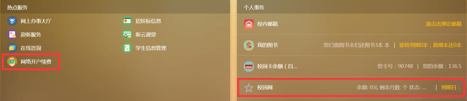 2、在打开的平台主页面的“个人事务—校园网”区域,可查看到当前账户网费余额、剩余月数、到期日等信息(见图一)。(余额/剩余月数均为0时,则需在到期日前充值,否则到期后会自动断网;余额等信息仅供参考,最终以校园缴费平台等系统实际业务处理记录为准。)