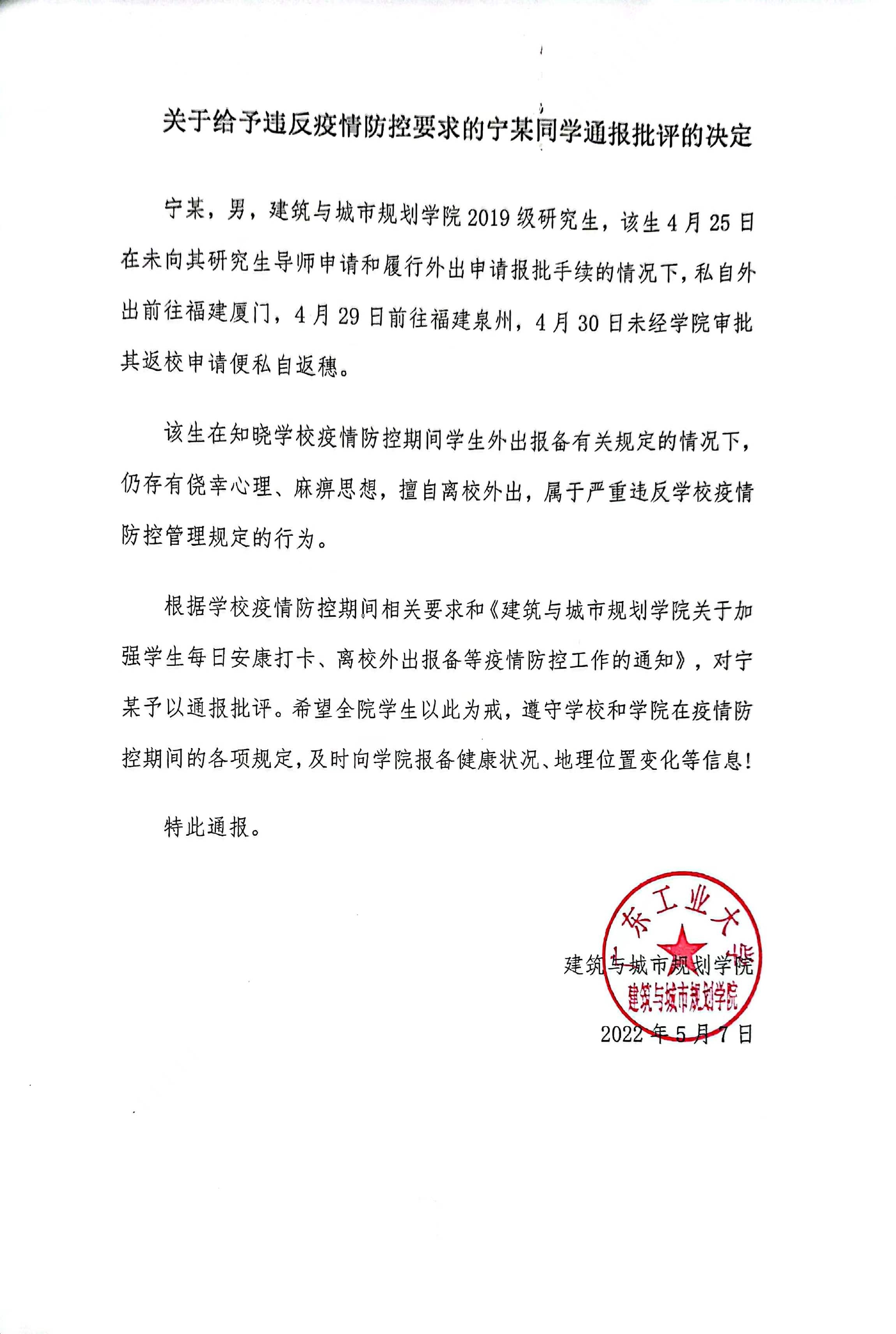 关于给予违反疫情防控要求的宁某同学通报批评的决定
