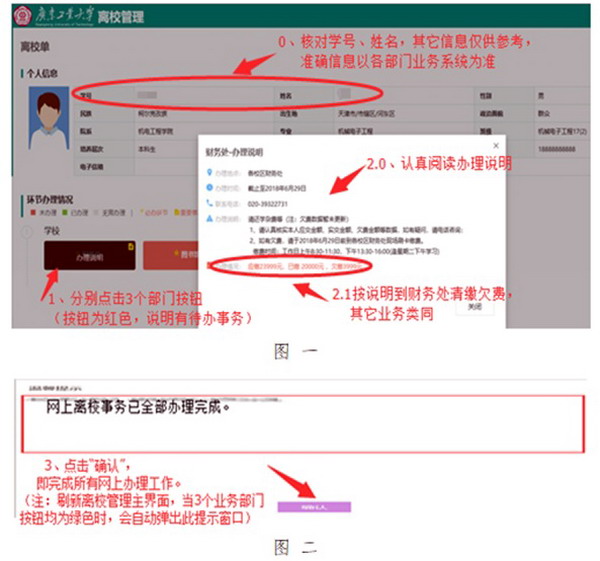 3.当所有事务均办理完成后(即3个模块按钮均显示为绿色),系统将自动弹出窗口提示“离校网上事务已全部办理完成”,点击“确认”后,即完成所有需在网上办理的离校事务(见附图二)。