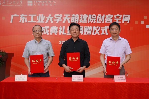 颜家国总裁(中)、何振炎主任(左)、蔡云楠院长(右)签署创客空间捐赠协议