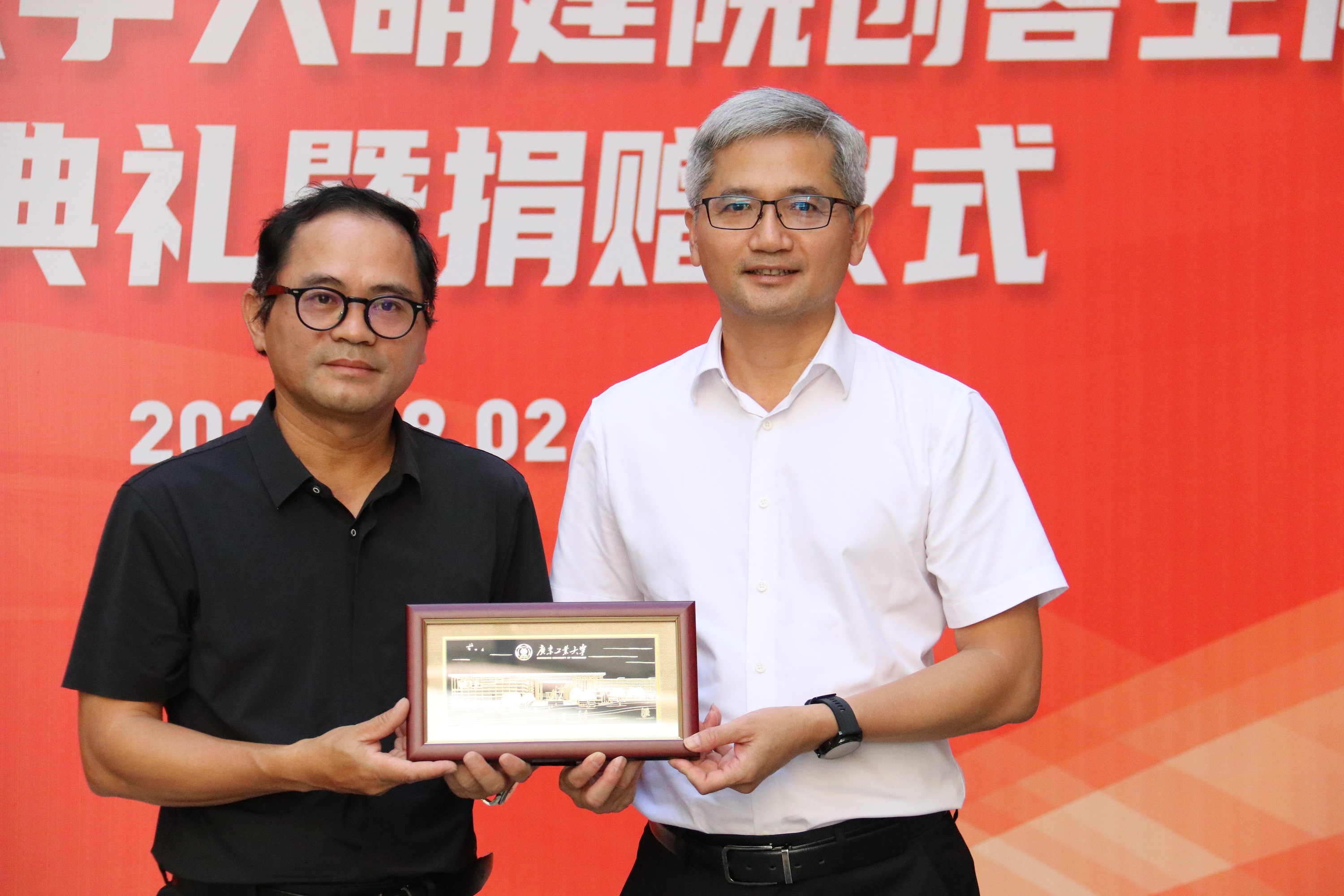 陈卓武副校长(右)向天萌建筑设计有限公司陈宏良董事长(左)赠送纪念品
